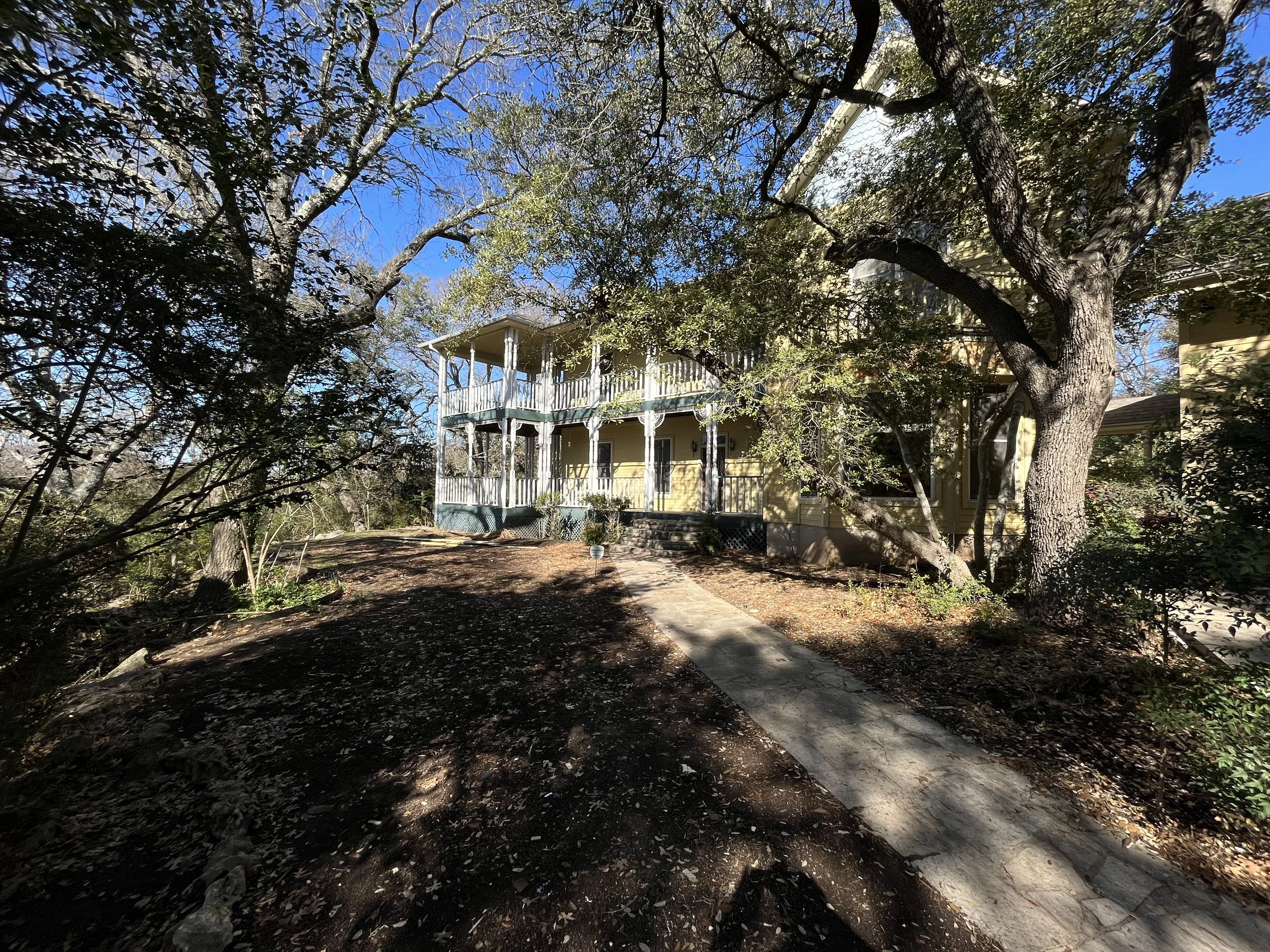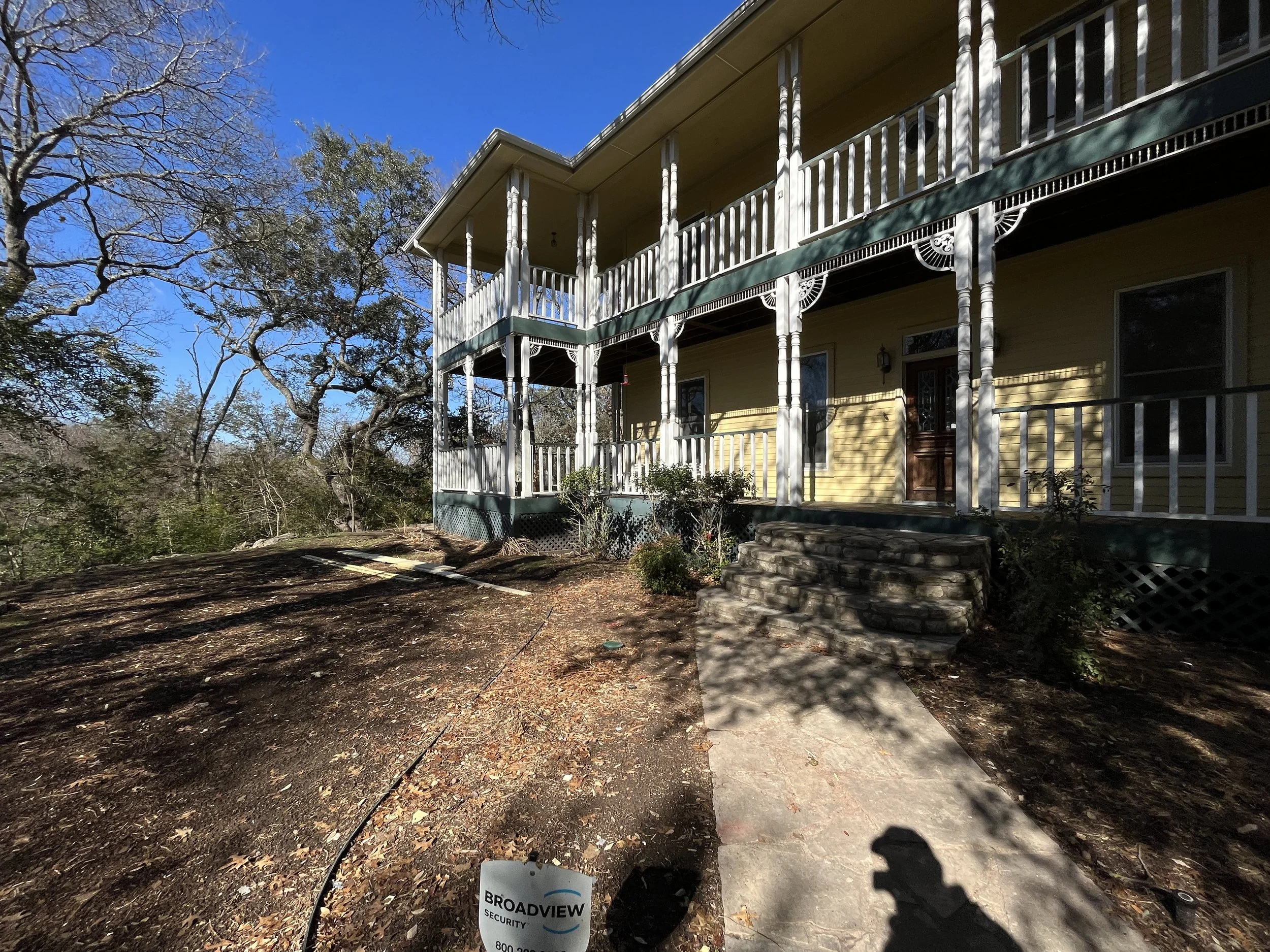 This gorgeous home sits on a wooded lot surrounded by deep canyons. Over time, the tree cover paired with erosion caused the lawn to die out. This coupled with two big freezes and exterior renovations caused the rest of the plants in the front to die as well.